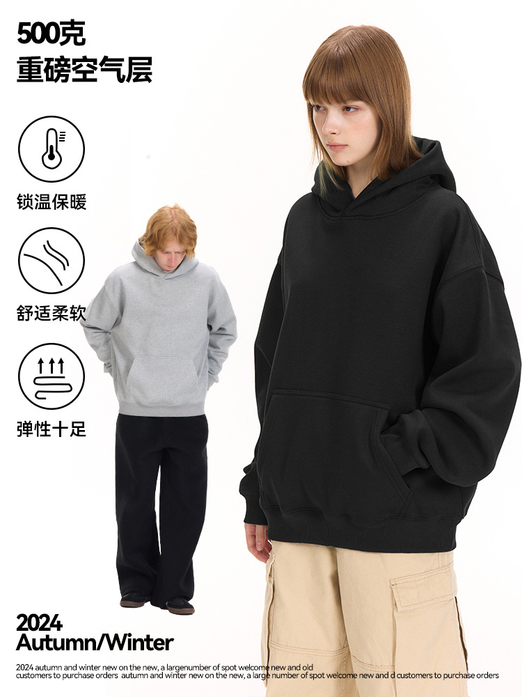 UNF 500G重磅保暖空气层套头纯色卫衣加绒加厚连帽卫衣男女秋冬